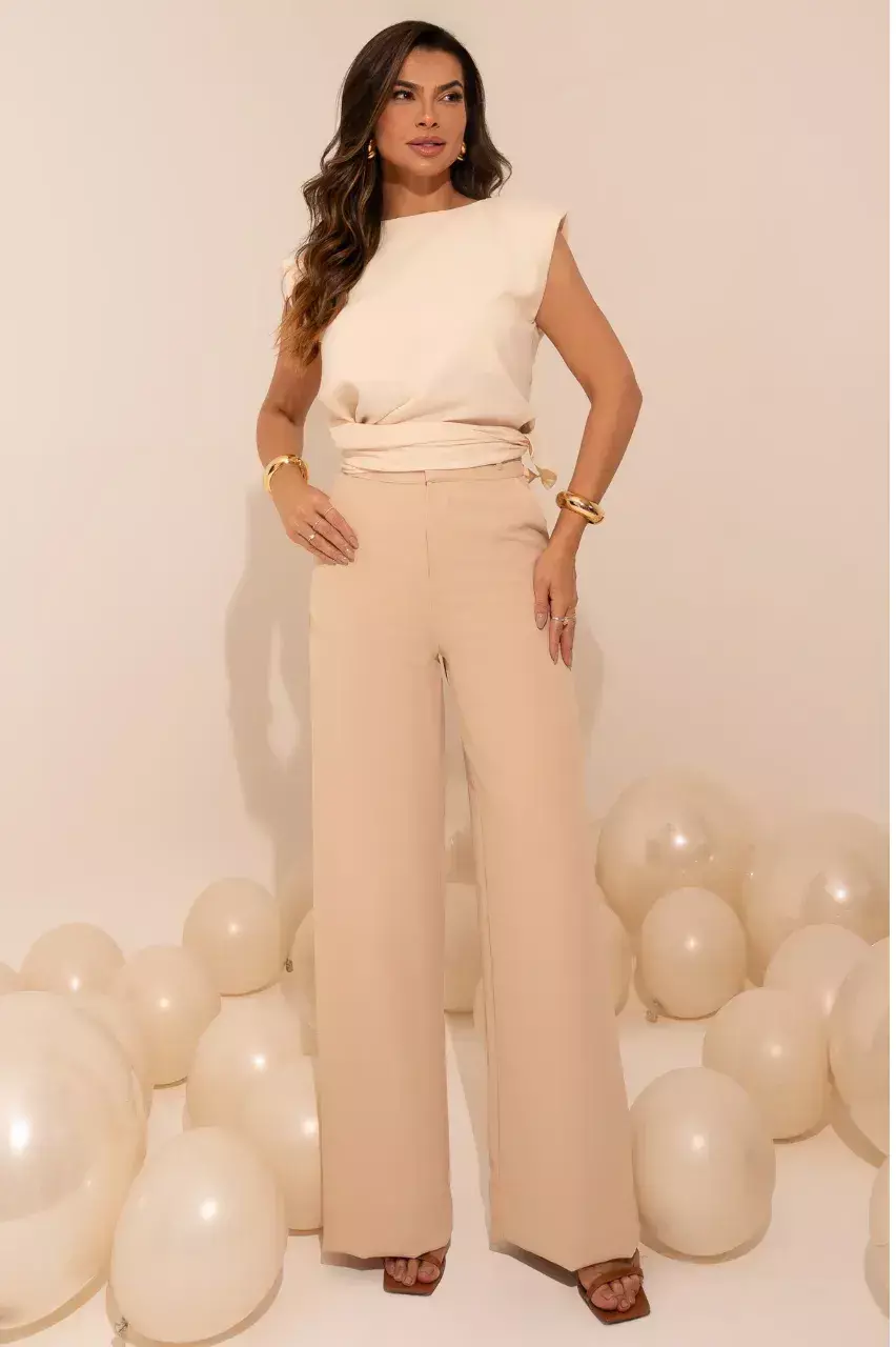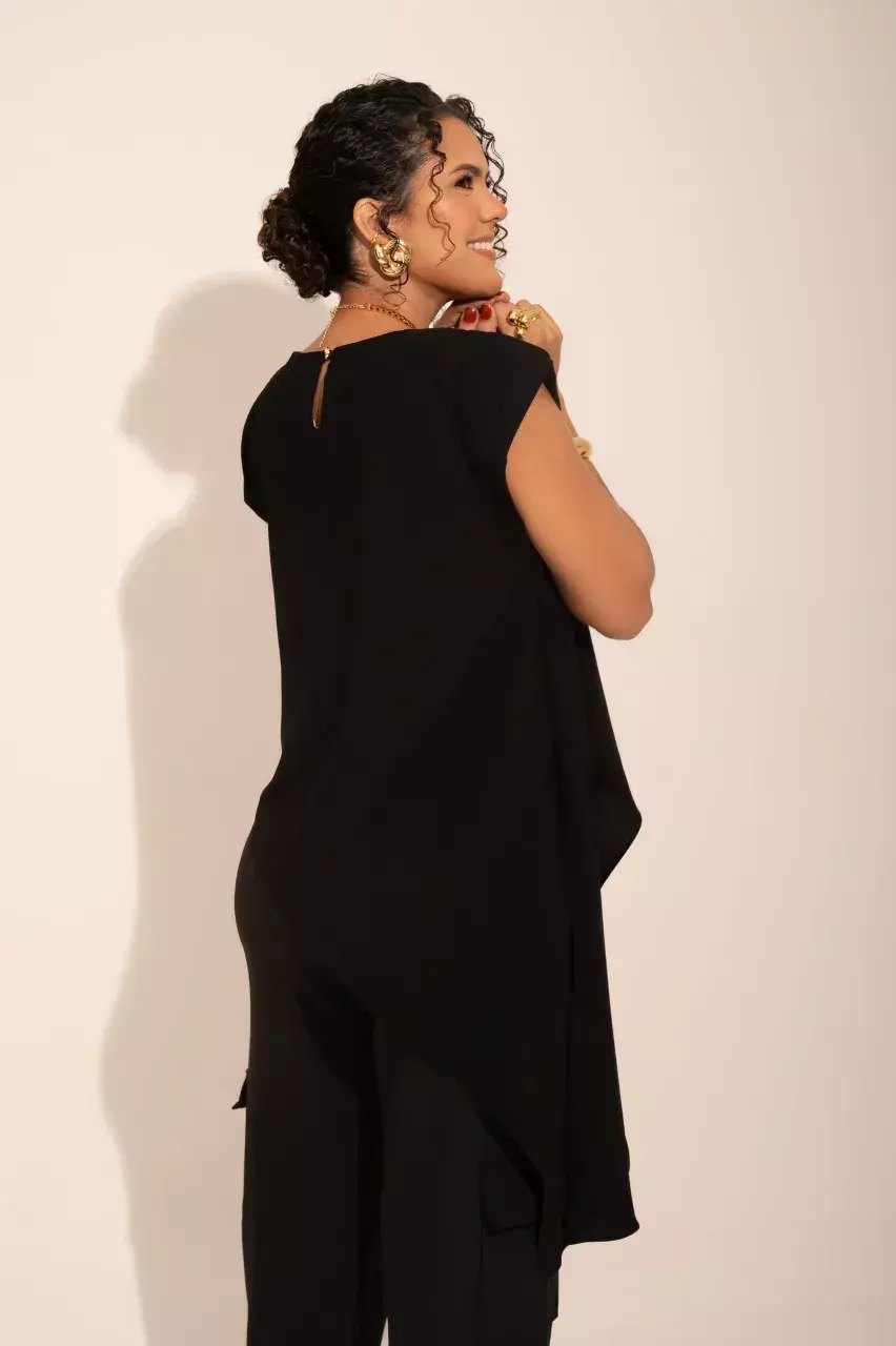 Confeccionada em crepe 100% poliéster, une fluidez e estrutura, garantindo caimento impecável e versatilidade para transitar do dia à noite com elegância.