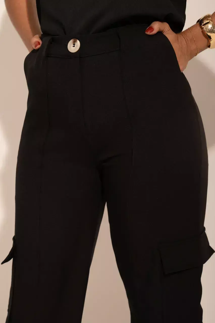 Sua modelagem reta, inspirada no estilo cargo, apresenta bolsos utilitários laterais que adicionam personalidade e modernidade ao look, sem abrir mão da sofisticação. O cós alto e ajustado valoriza a silhueta, enquanto os recortes verticais alongam e conferem proporções equilibradas.
